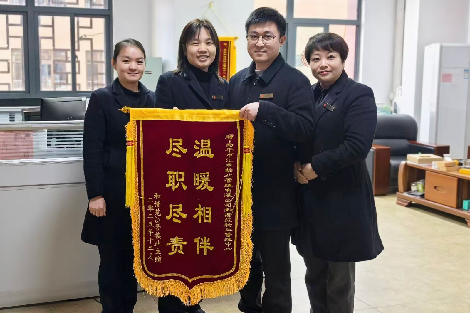 近日,云谷一期和谐苑服务中心收到业主赠予的一面写有“尽职尽责,温暖相伴”的锦旗。这面锦旗既是一份荣誉,也体现了业主对物业服务工作的充分肯定与信任,为冬日里的物业服务工作注入了温暖与动力。